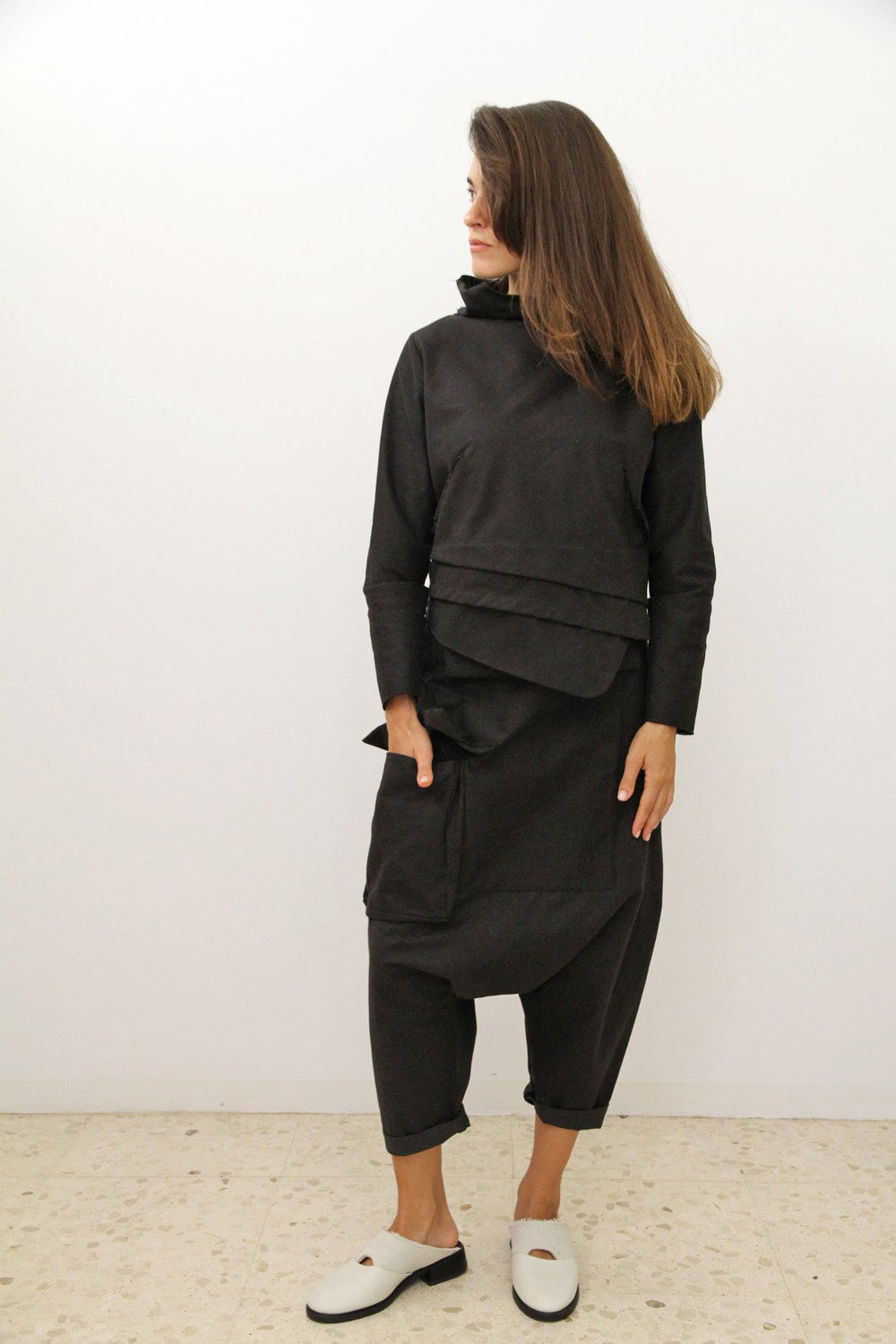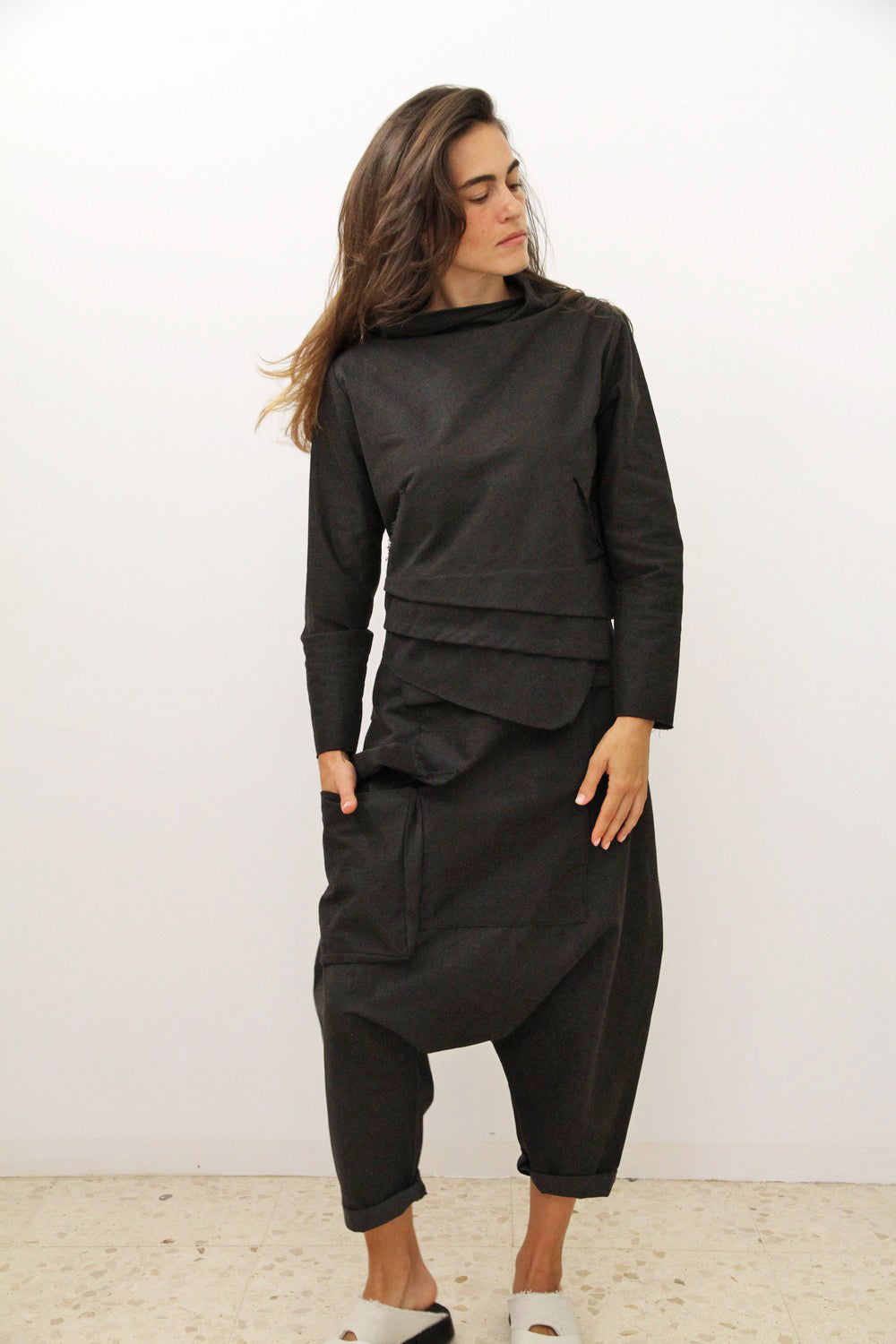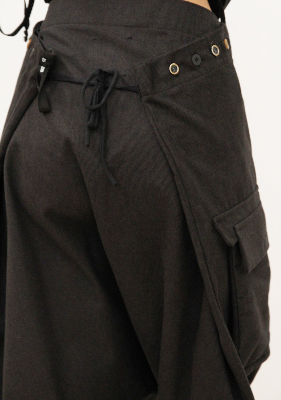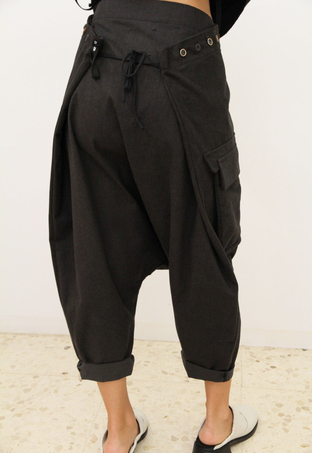 Унісекс гарем брюки з 3 кишенями. Розмір брюків регулюється ґудзиками на поясі та стрічками ззаду. Брюки можна носити з високою або низькою талією.