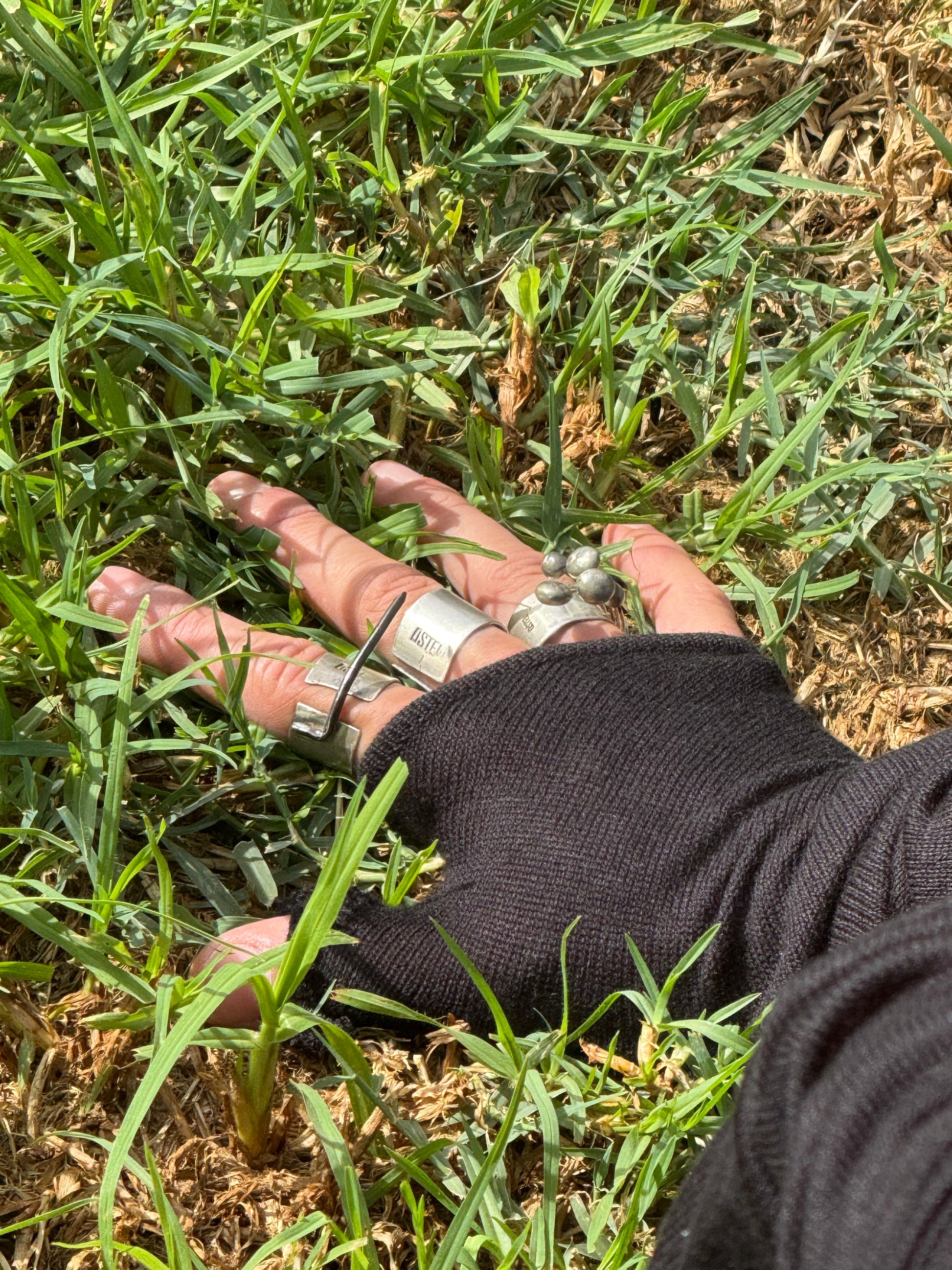 Бронзові сфери, немов роса, лежать на срібних лозах, кожен елемент сформований силою тяжіння та наміром. Форми сирі, недосконалі, тактильні — ніби природа, перервана посеред руху.